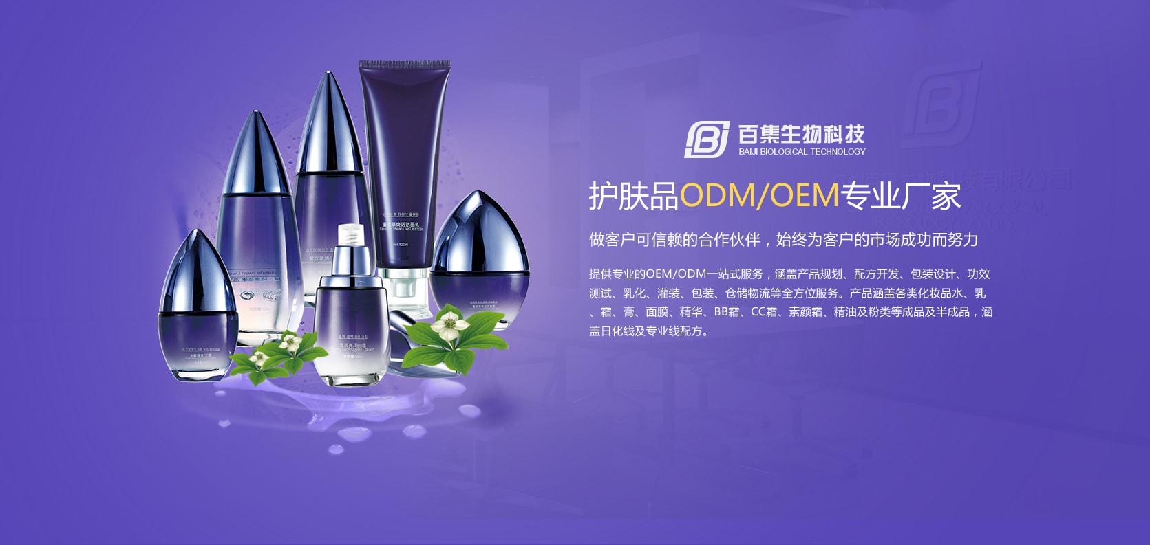 廣州市百集生物科技有限公司成立于2012年,坐落在亞洲化妝品硅谷的廣州市白云區(qū),是一家具有現(xiàn)代化管理、專(zhuān)業(yè)化水準(zhǔn)的化妝品研發(fā)及制造基地,為客戶(hù)提供專(zhuān)業(yè)的OEM/ODM一站式服務(wù),涵蓋產(chǎn)品規(guī)劃、配方開(kāi)發(fā)、包裝設(shè)計(jì)、功效測(cè)試、乳化、灌裝、包裝、倉(cāng)儲(chǔ)物流等全方位服務(wù)。產(chǎn)品涵蓋各類(lèi)化妝品水、乳、霜、膏、面膜、精華、BB霜、CC霜、素顏霜、精油及粉類(lèi)等成品及半成品,涵蓋日化線(xiàn)及專(zhuān)業(yè)線(xiàn)配方。公司秉承“創(chuàng)新、共贏(yíng)”的核心價(jià)值觀(guān)......